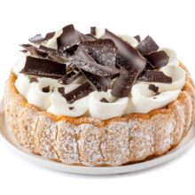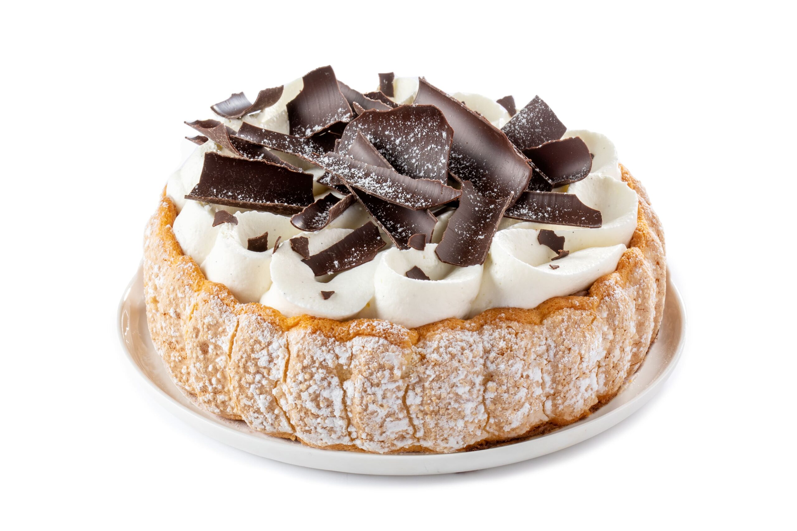 Une charlotte généreuse composée d’un biscuit moelleux et d’une crème Madame onctueuse à la vanille et d’une mousse au chocolat, parsemée d’éclats de chocolat. Un dessert de partage, à la fois doux et intense. Composition : Biscuit, crème mascarpone, vanille, chocolat. Allergènes : œuf, lait, gluten.
