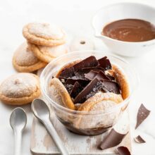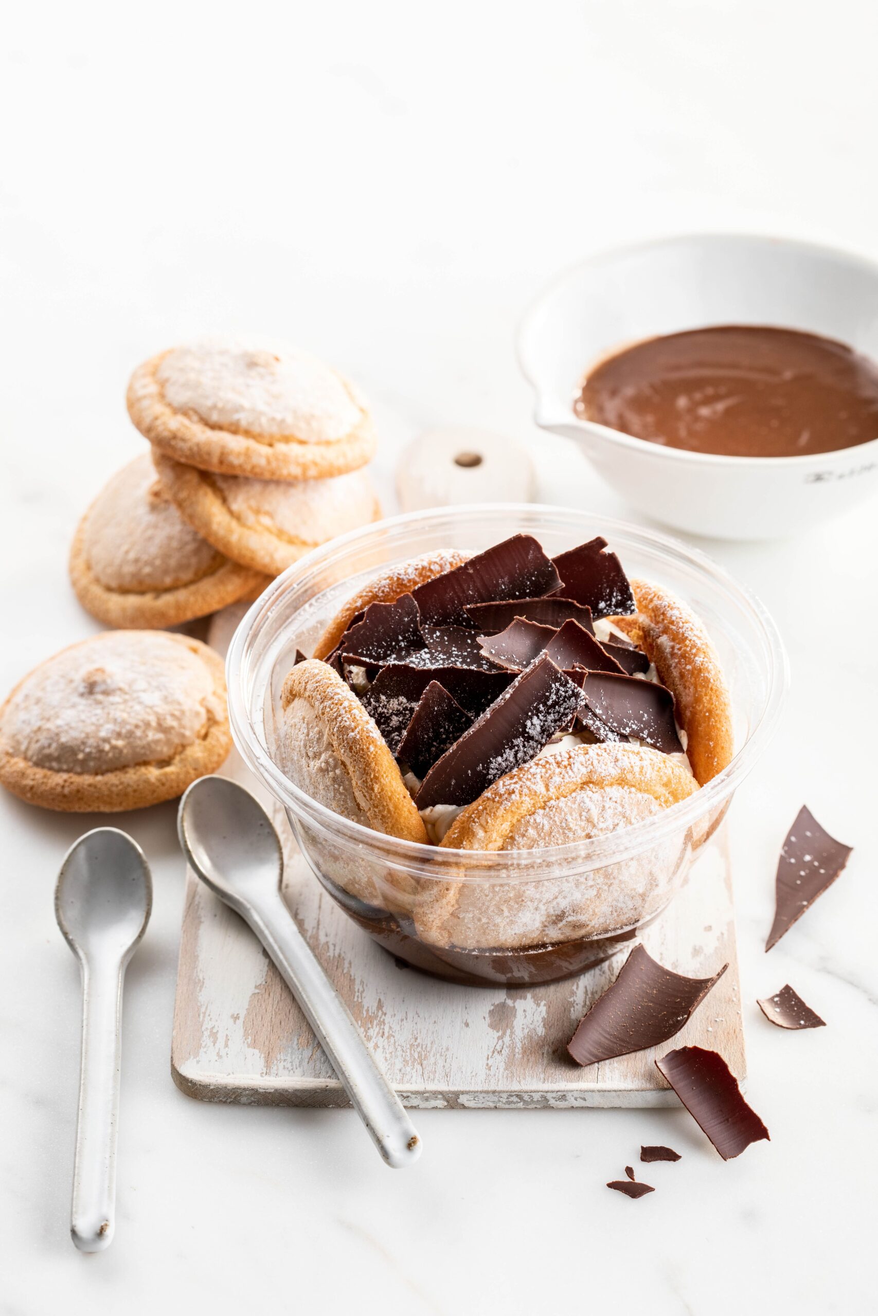 Un petit dessert raffiné, où se mêlent vanille soyeuse et chocolat noir croquant. Composition : Biscuit, crème mascarpone, vanille, chocolat. Allergènes : œuf, lait, gluten.