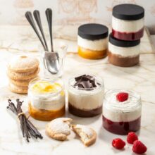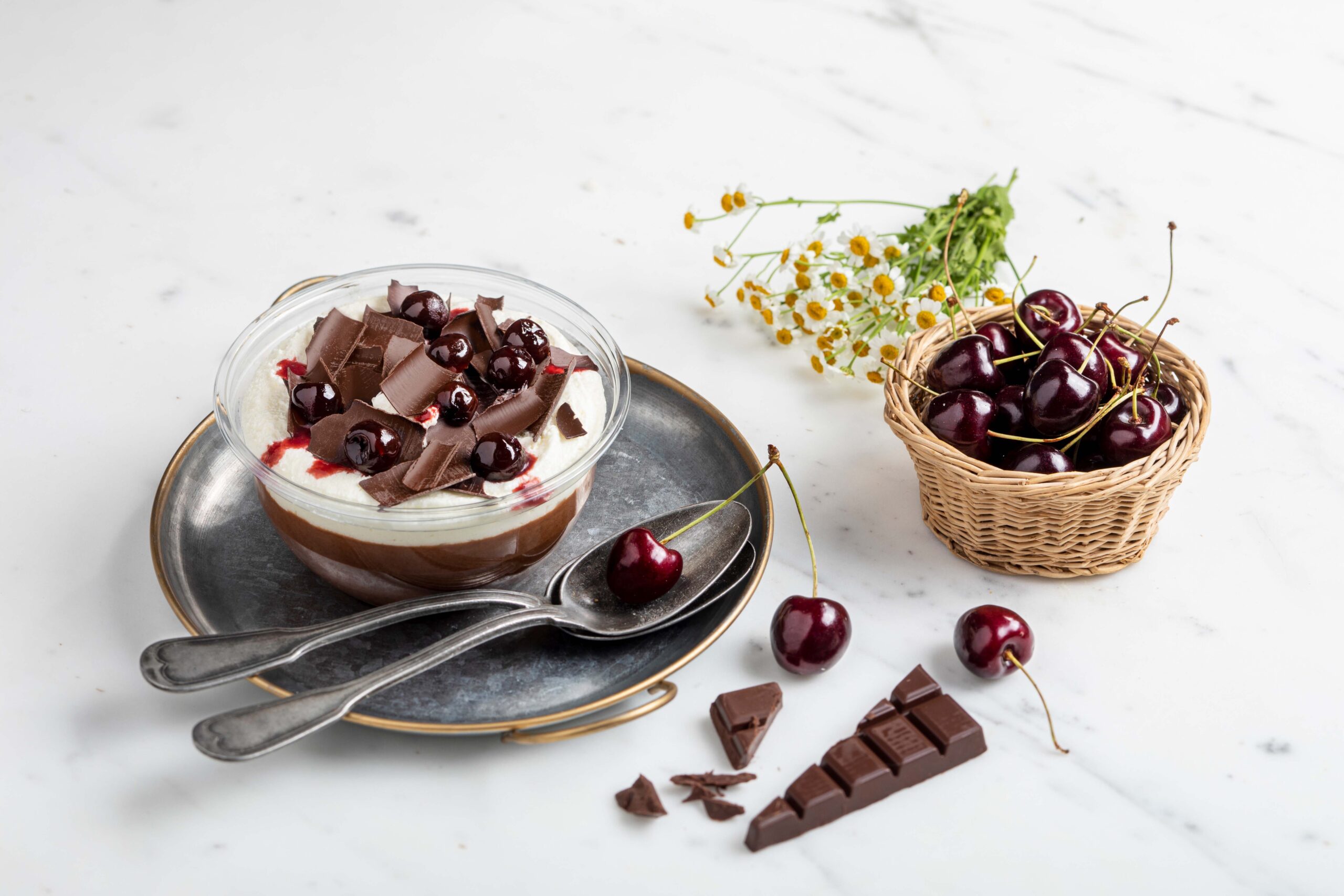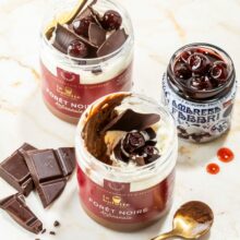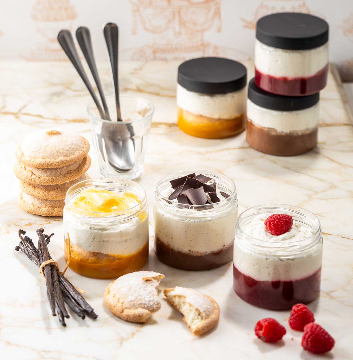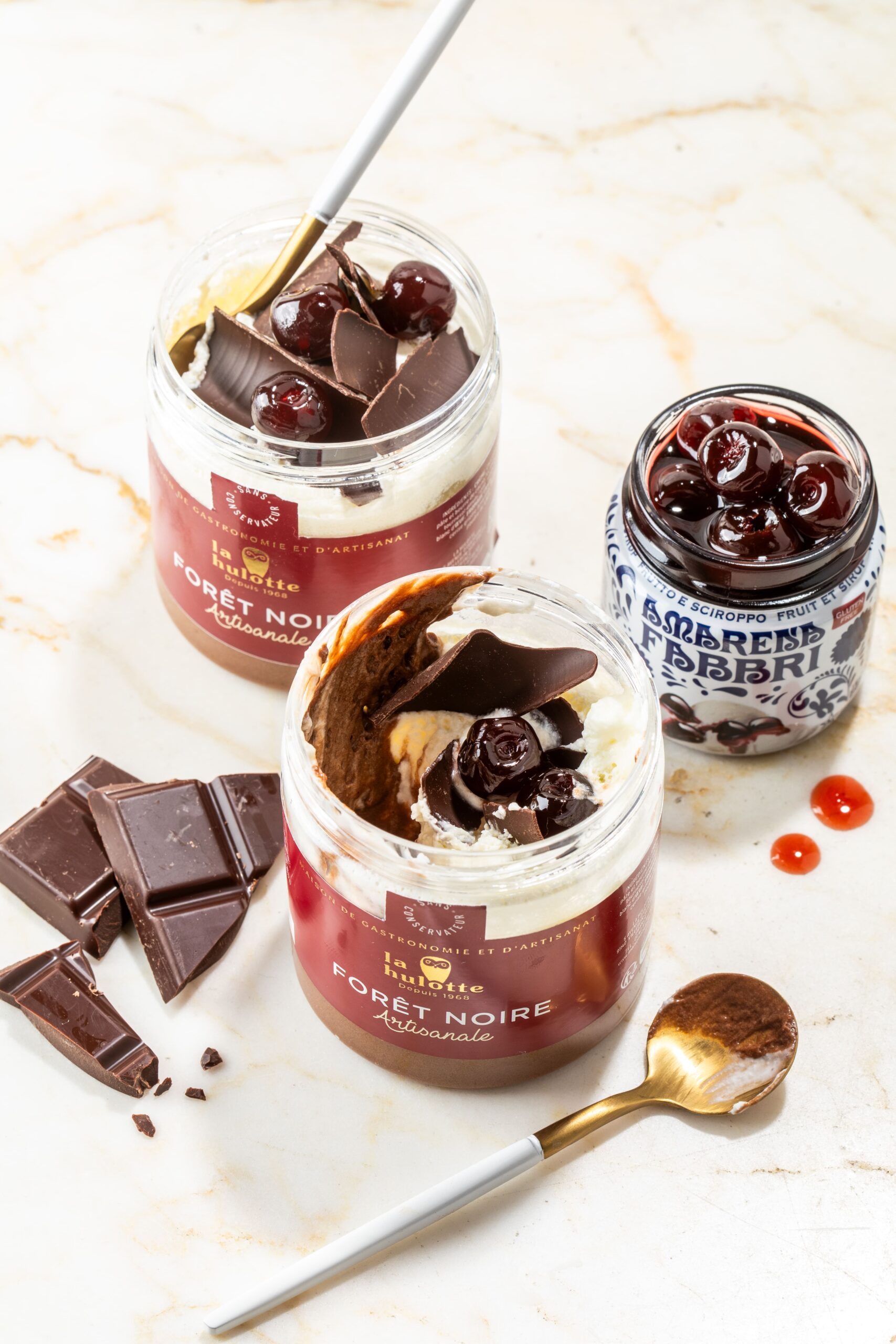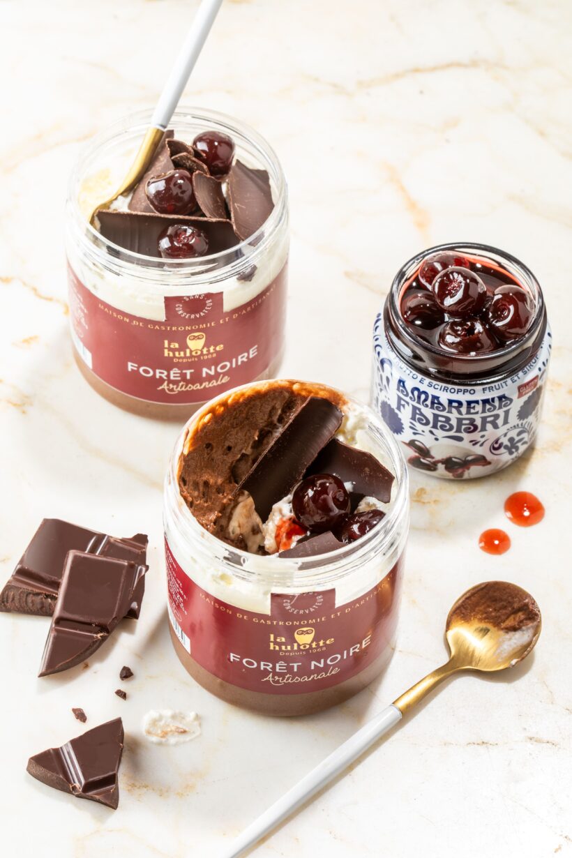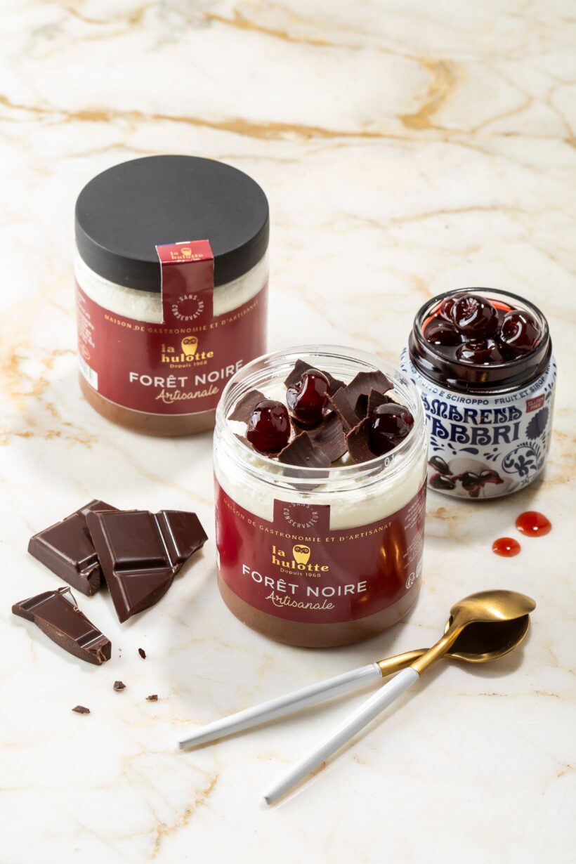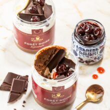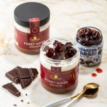 Une bouchée gourmande de forêt noire revisitée sans biscuit, dans un format élégant. Griotte, cacao, crème fouettée. Composition : crème, griottes, chocolat. Allergènes : œuf, lait.