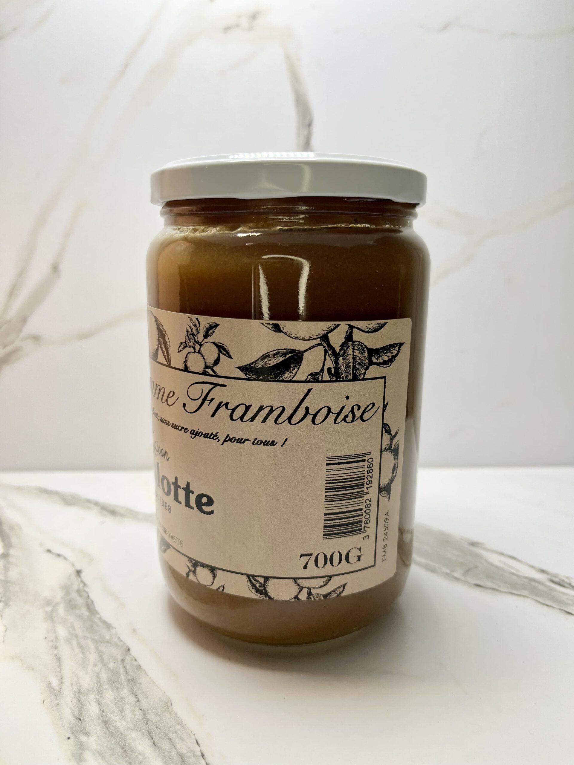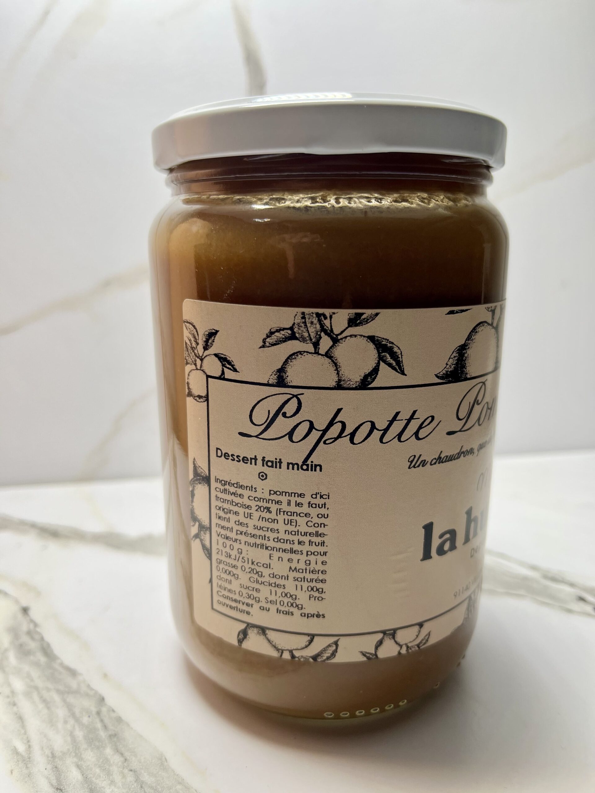 Une alliance vive et gourmande, où la pomme adoucit le caractère légèrement acidulé de la framboise. Une popotte artisanale, cuite au chaudron, parfaite pour le petit-déjeuner comme pour un goûter raffiné. 700g de gourmandise. Composition : Pomme, framboise. Allergènes : aucun.