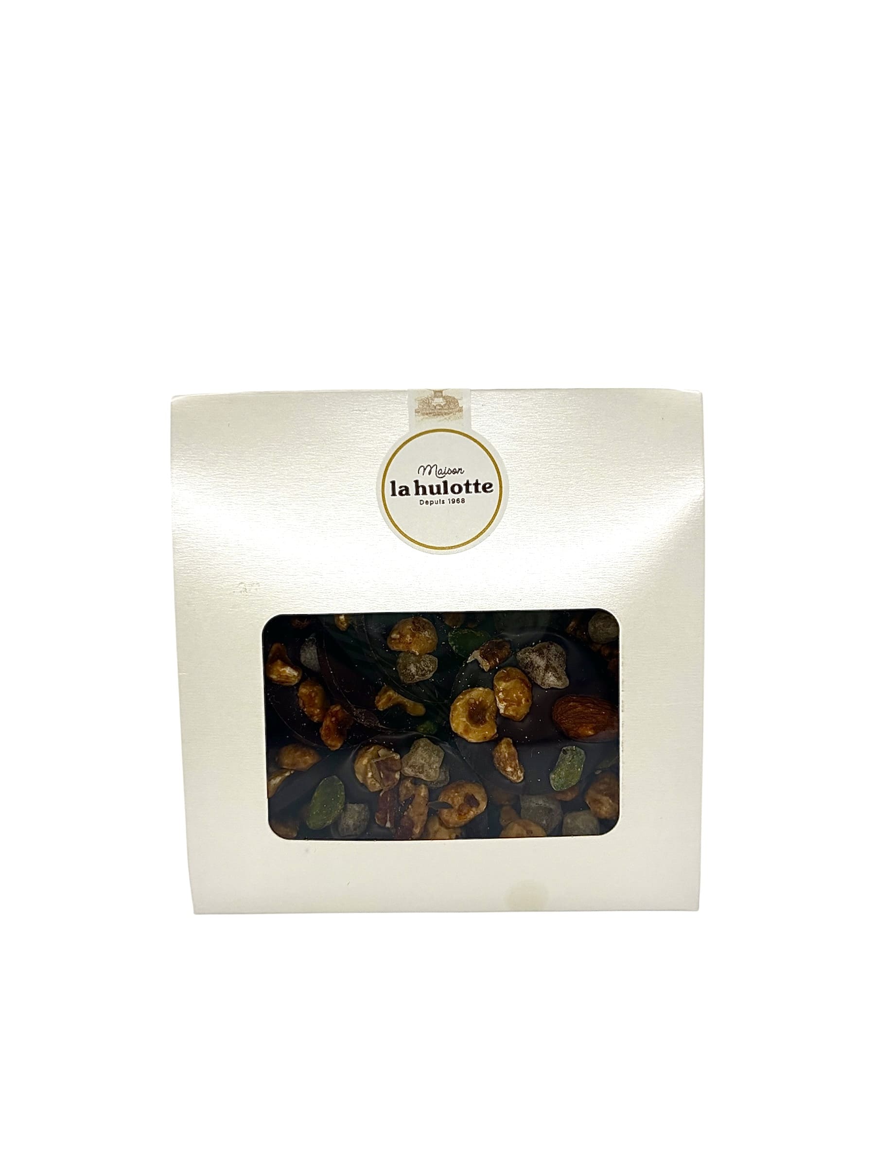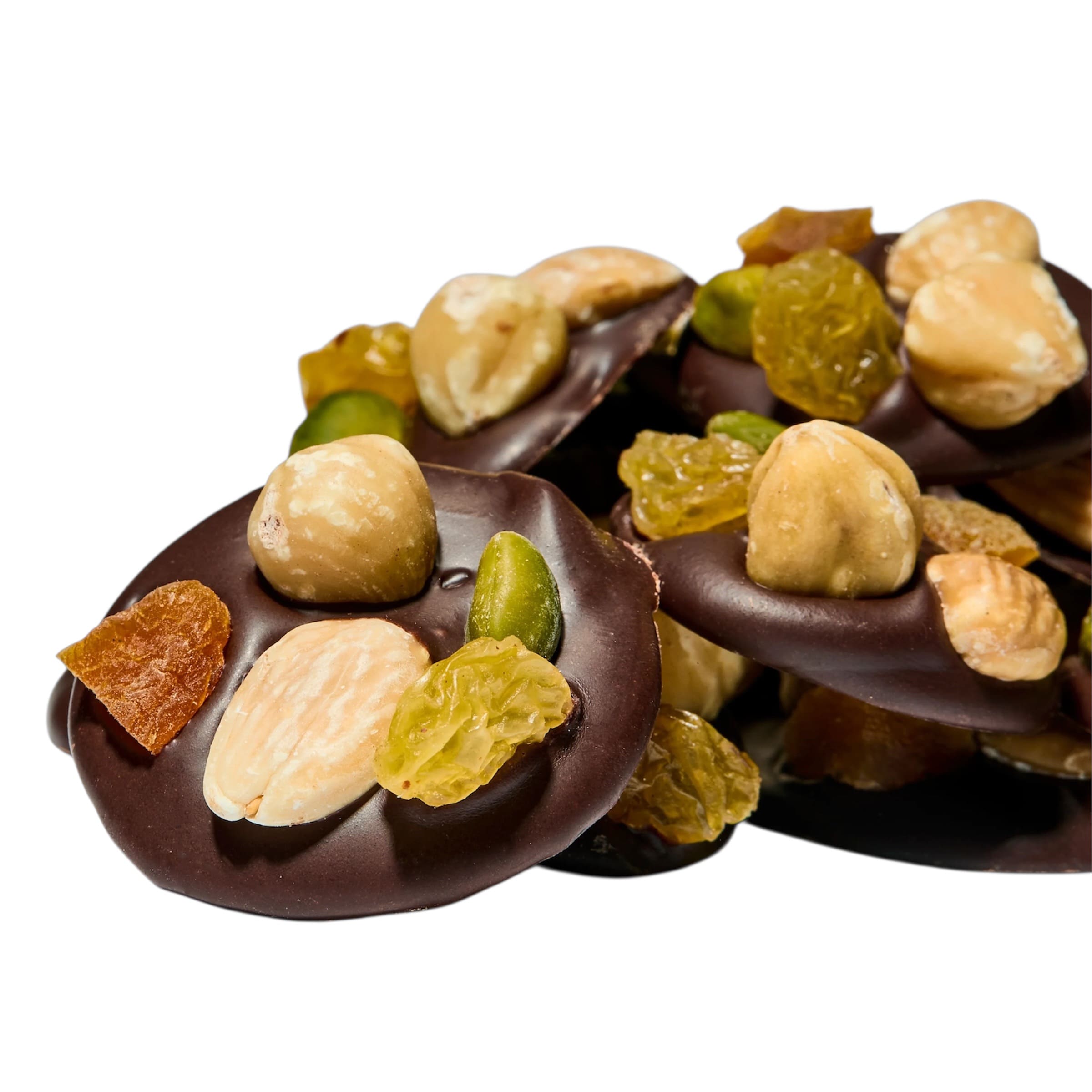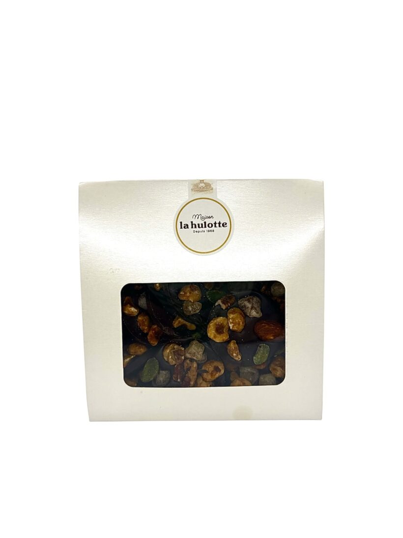 Le contraste parfait entre l’intensité du chocolat noir et la gourmandise des fruits secs et confits. Des bouchées artisanales à croquer à l’envie. 150g de gourmandise. Composition : Chocolat noir, fruits secs, fruits confits. Allergènes : fruits à coque, soja. 150g.